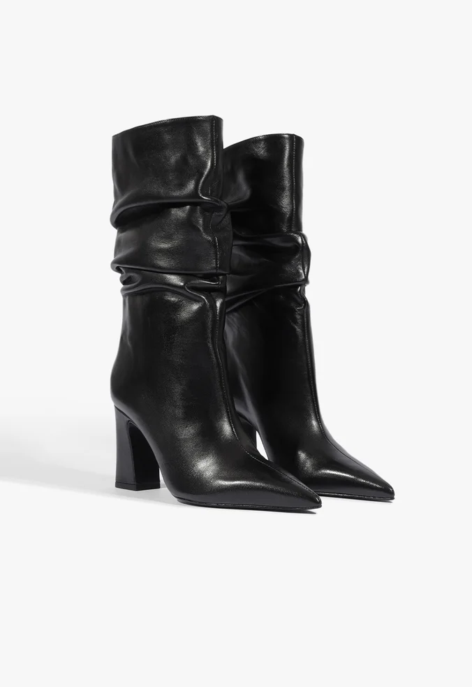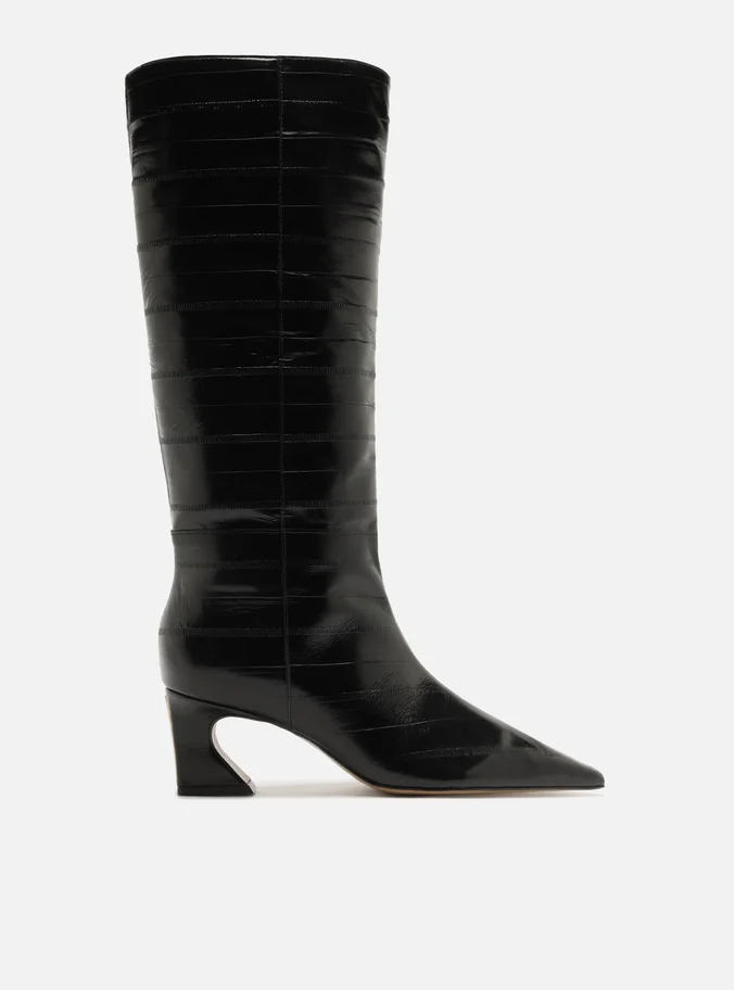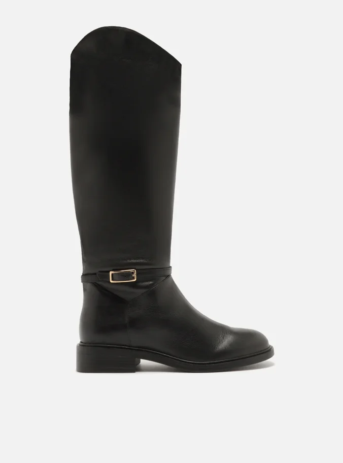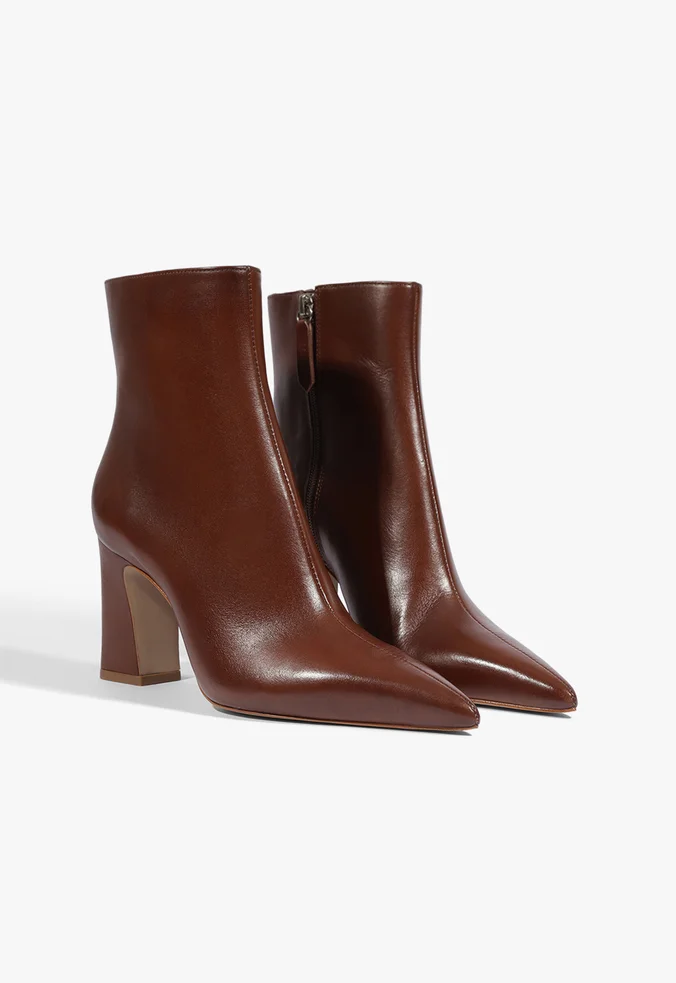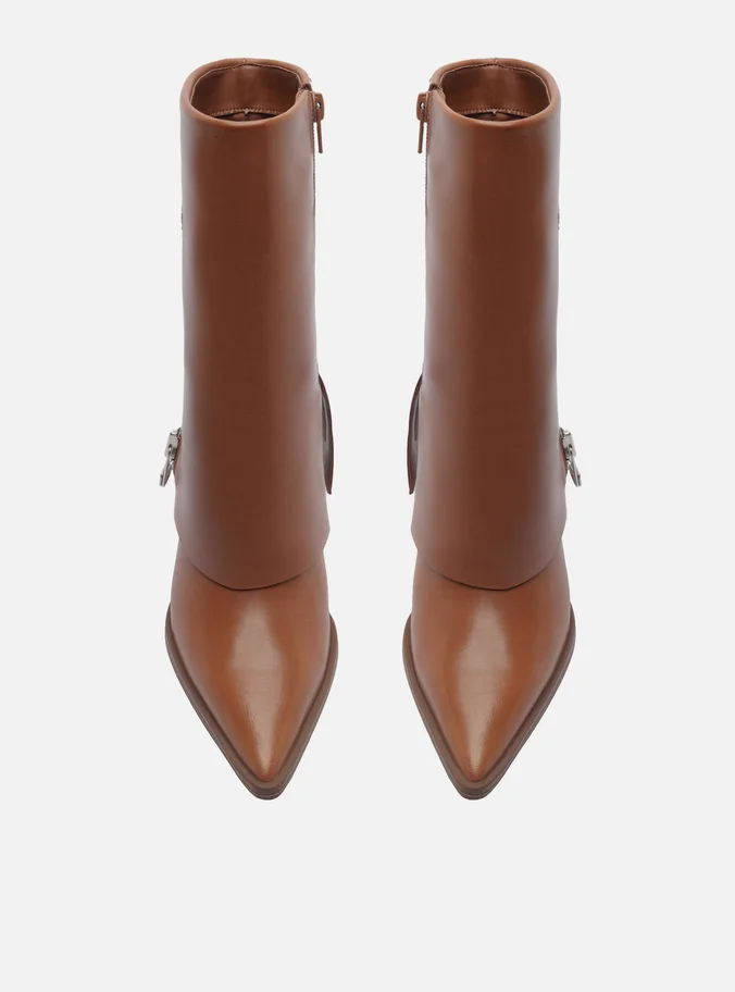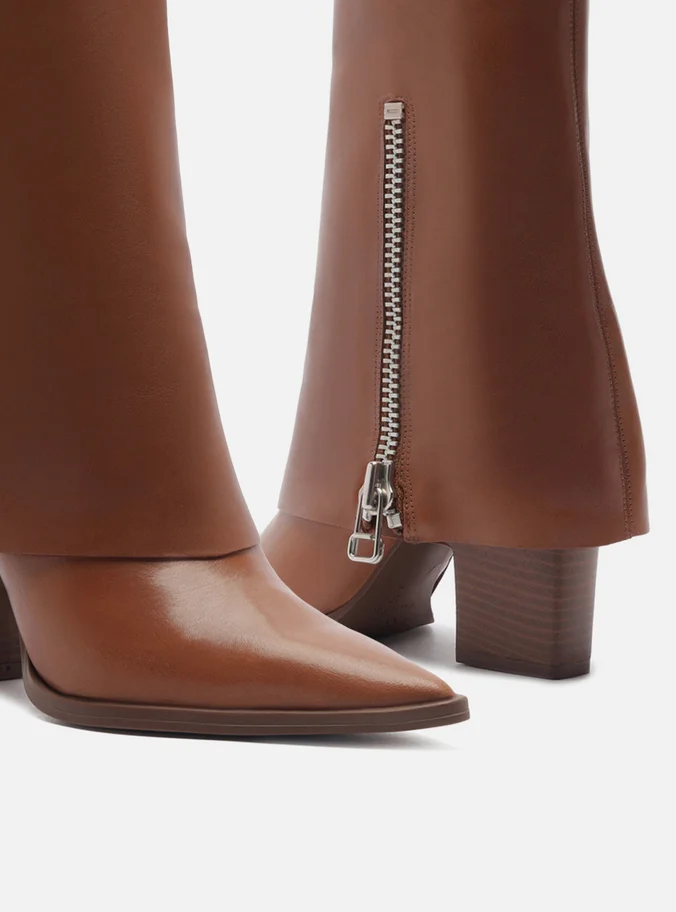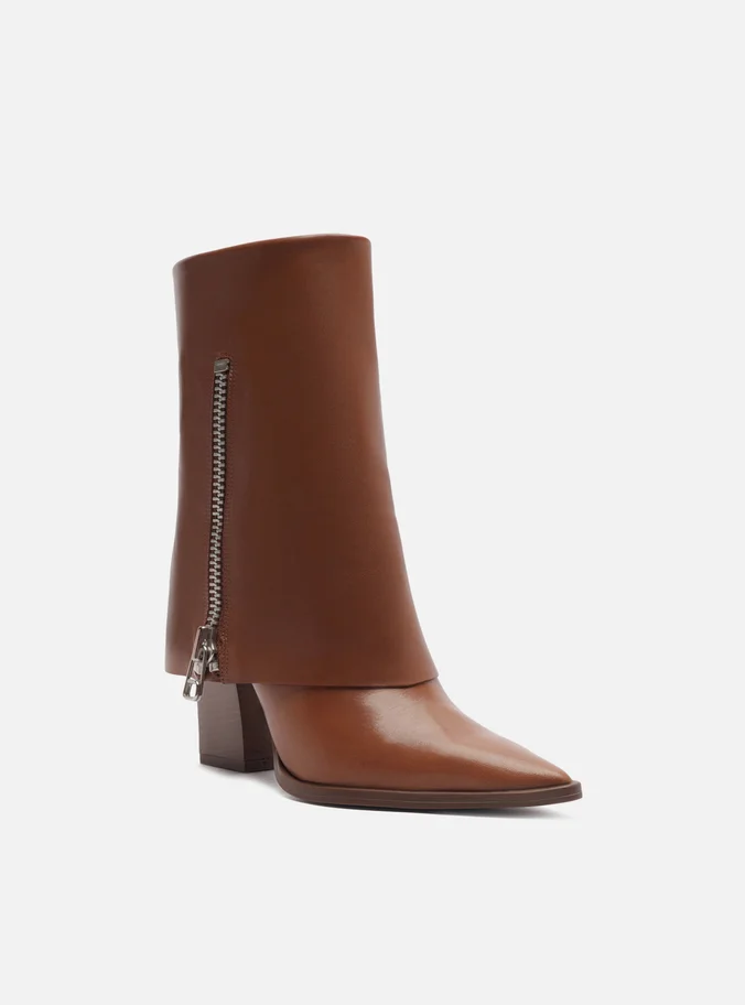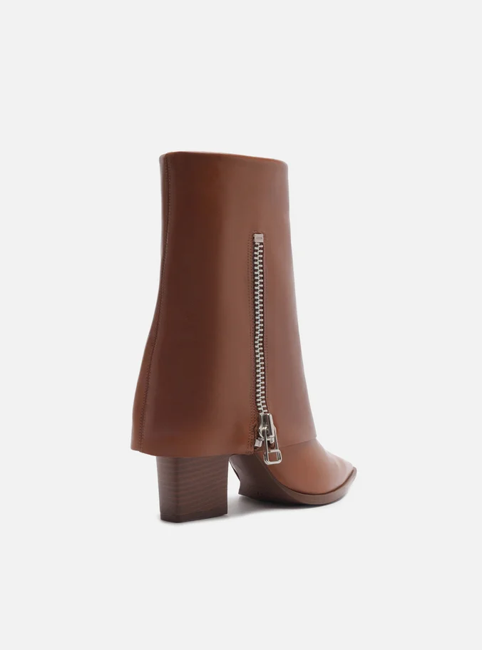 Bota feminina marrom em couro. O sapato tem cano médio, salto médio bloco revestido em couro, lateral do cabedal, zíper metálico marrom com puxador e tiras largas nos canos. Possui bico quadrado e solado com costura.