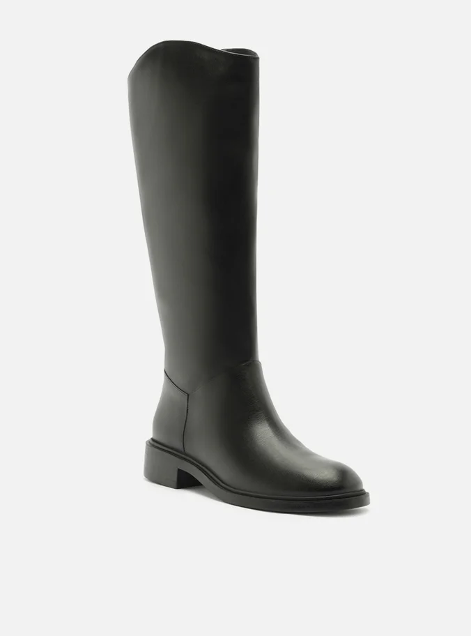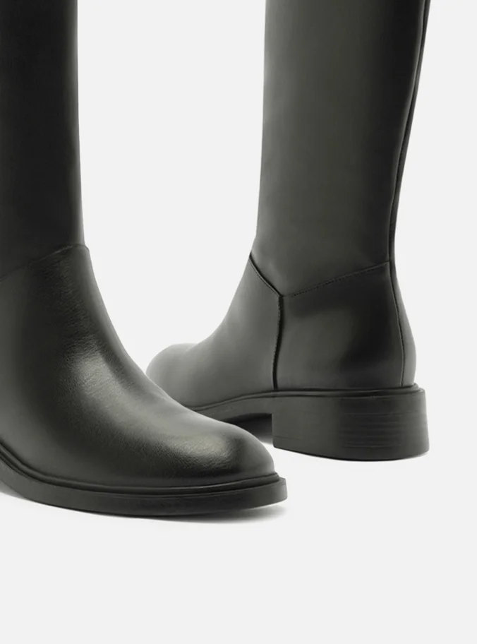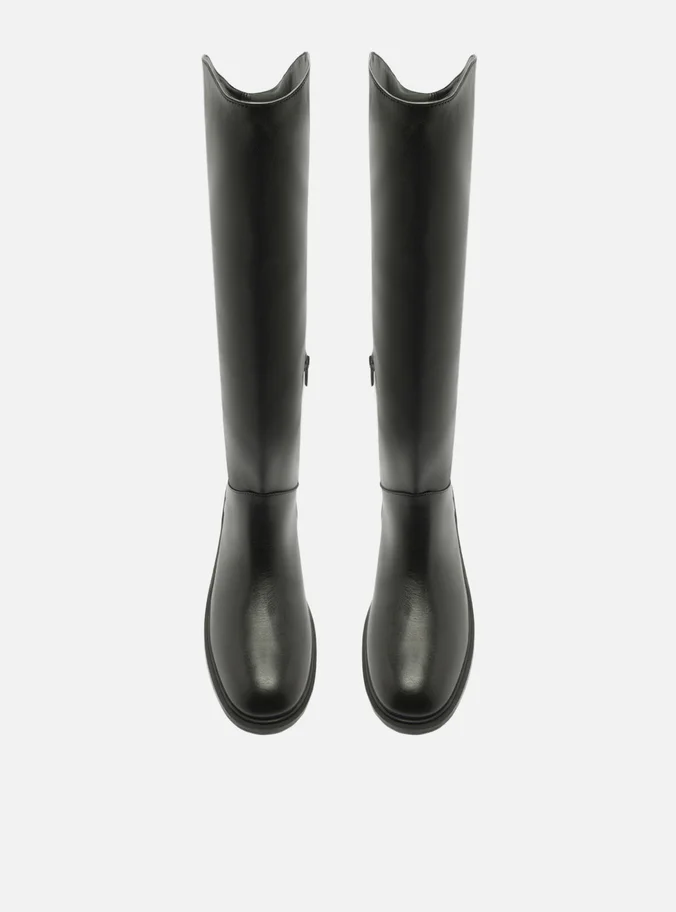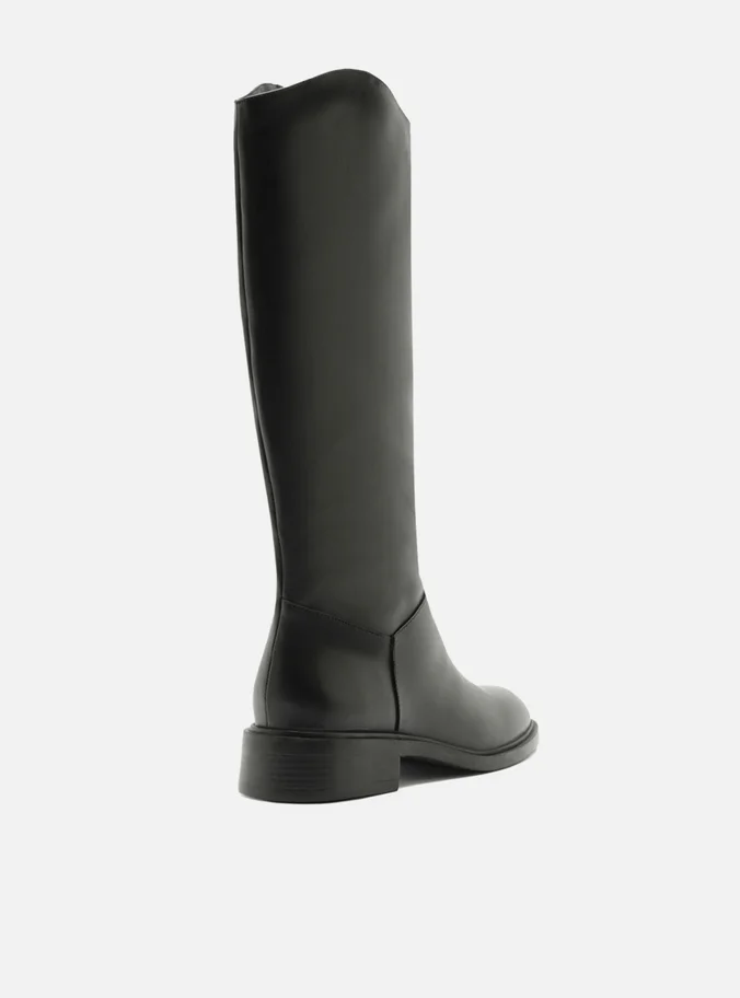 Bota feminina preta. O sapato tem cano longo, salto baixo bloco em fachete e formato arredondado na ponta. Possui cabedal ajustado ao pé e fecho em zíper na lateral interna.