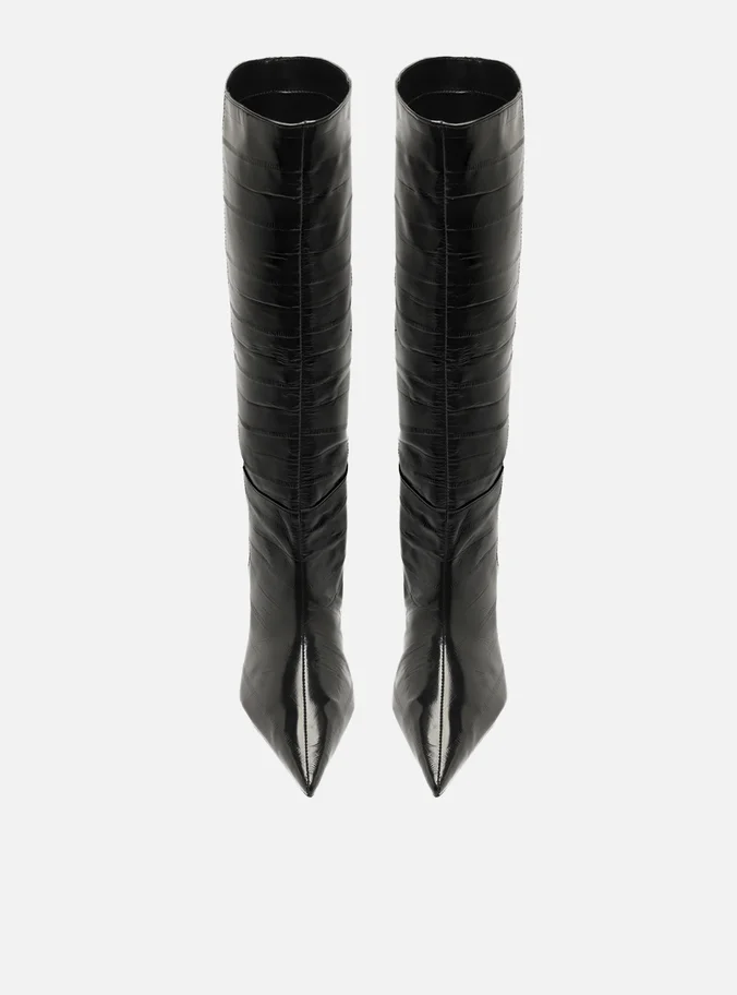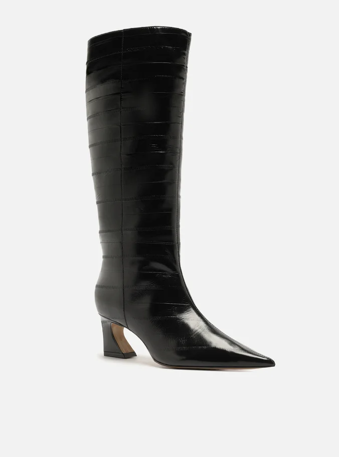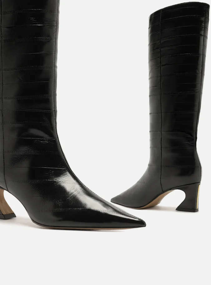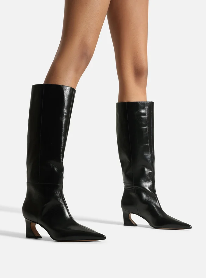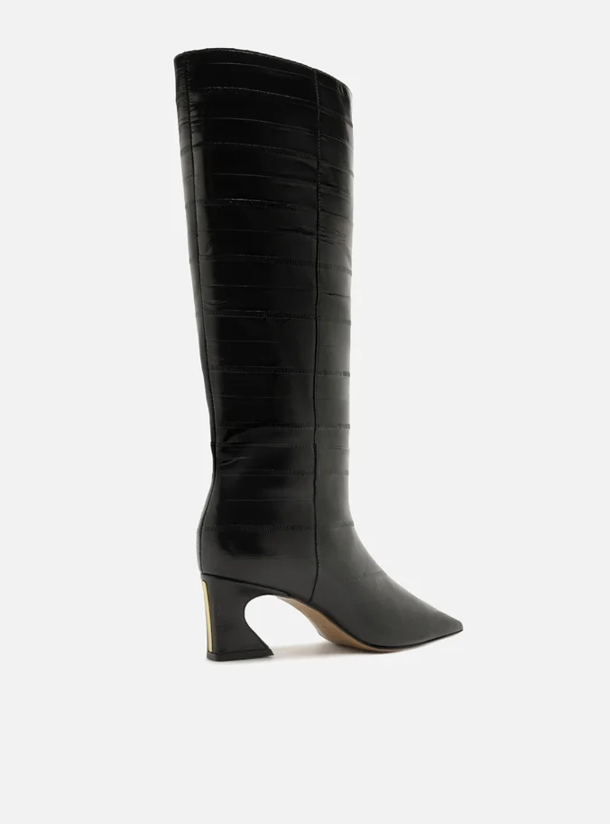 Bota preta de couro com acabamento em linhas. O sapato tem cano alto, salto médio flare e formato fino na ponta. Possui cabedal ajustado à perna e não apresenta fechamento.