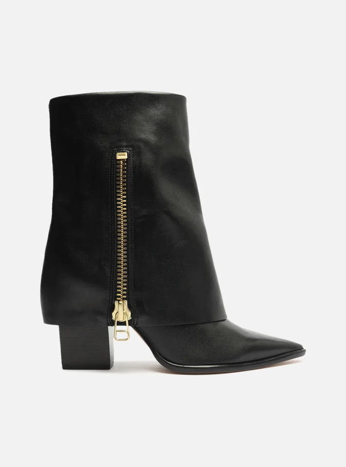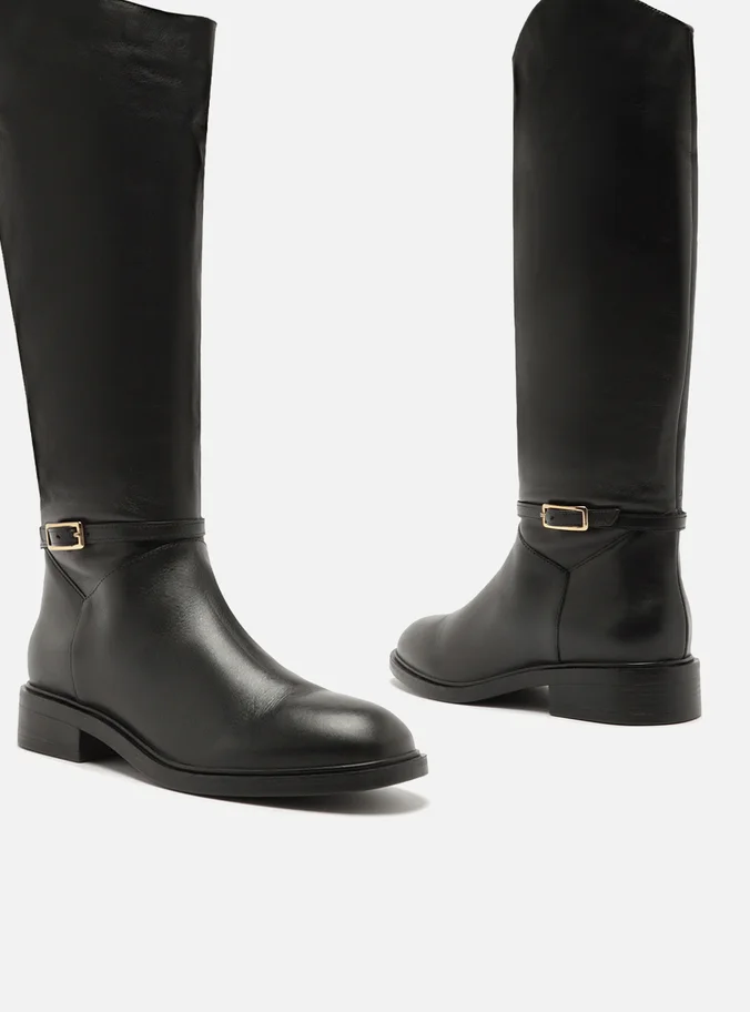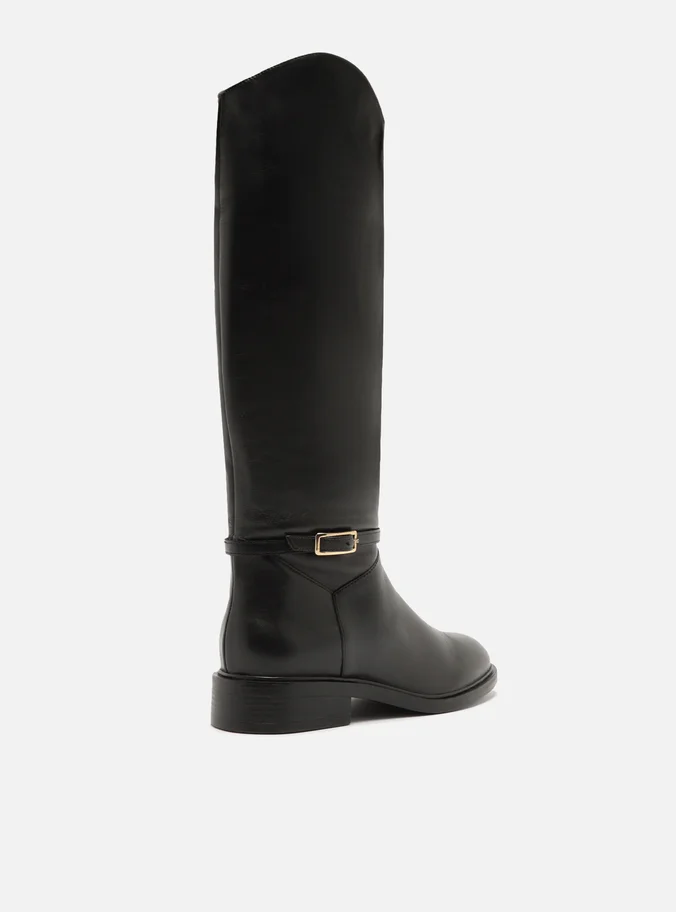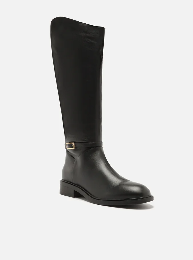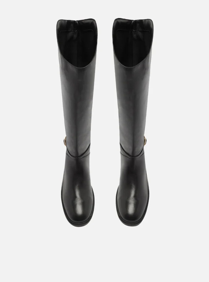 Bota preta de couro. O sapato tem cano longo, salto baixo bloco em fachete e formato arredondado na ponta. Traz cabedal ajustado ao pé e fecho em zíper na lateral interna do cano. Com tira em torno do cano e fivela metálica.