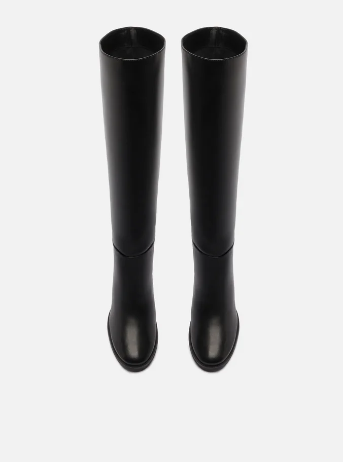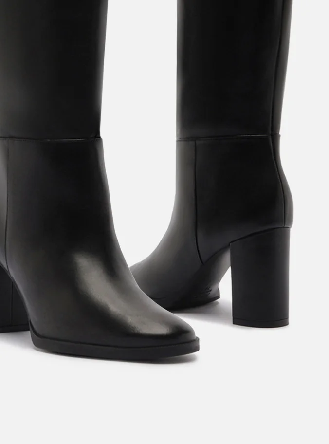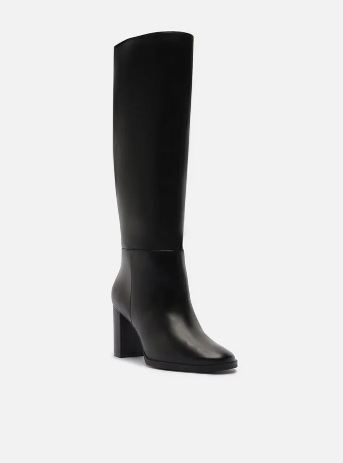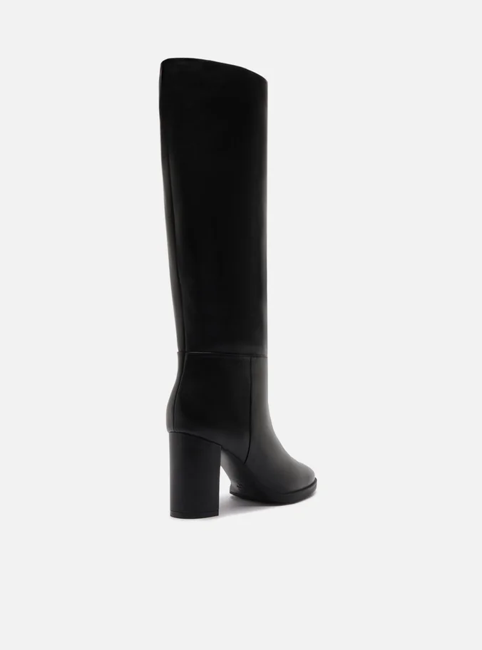 Bota preta de couro. O sapato tem cano longo, salto médio bloco e formato arredondado na ponta. Possui fecho em zíper na parte traseira.