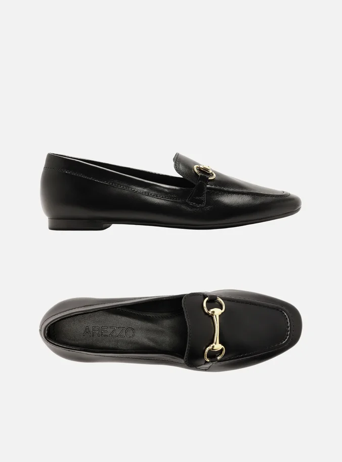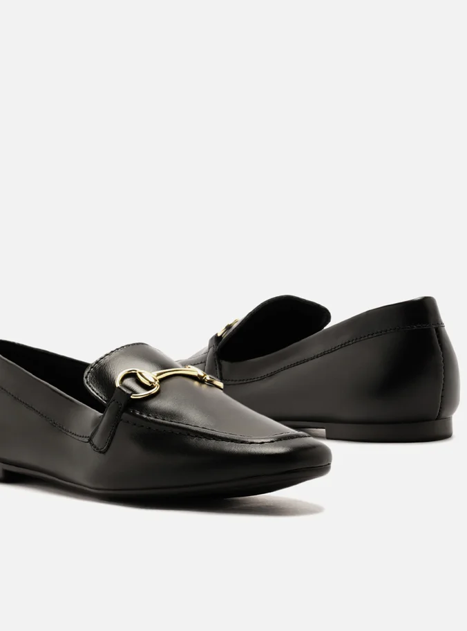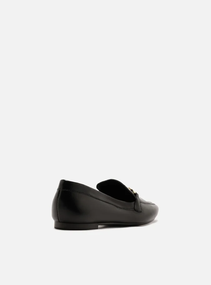 Mocassim feminino preto de couro. O sapato tem salto rasteiro e formato quadrado na ponta. Fechado, traz recorte lateral na gáspea e aplicação de bridão metálico dourado, preso por tiras, sobre o cabedal. Possui costura marcada no contorno da biqueira. Com palmilha bege e inscrição do nome da marca, exibe toda a parte superior do pé.