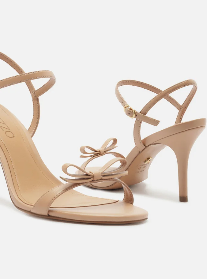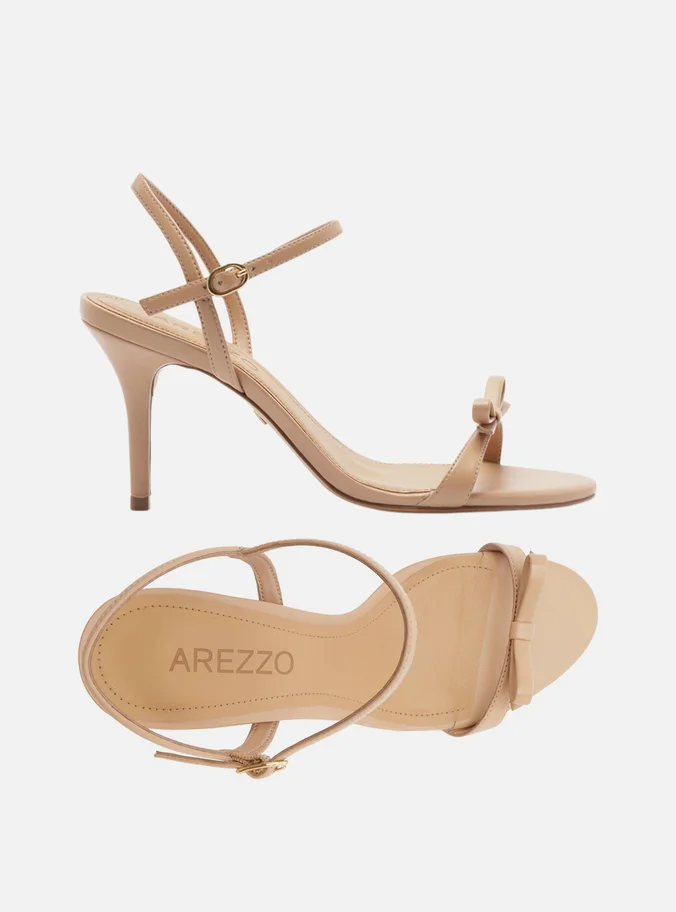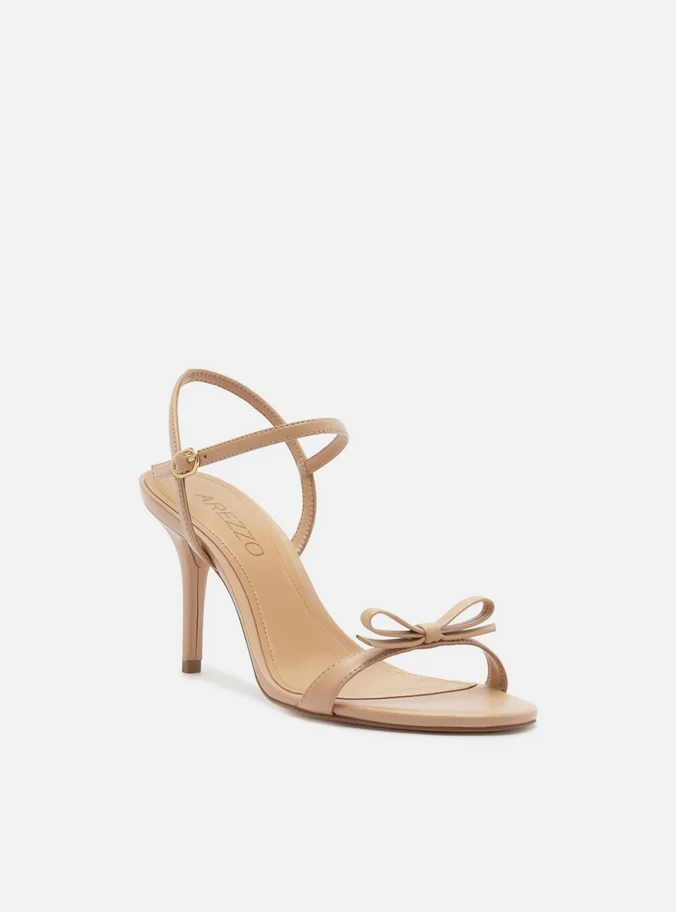 Sandália feminina nude. O sapato tem salto alto fino e formato arredondado na ponta. Traz tira única sobre os dedos com aplicação de laço. Possui tira fina que sai da parte lateral, cruza no calcanhar, contorna o tornozelo e fecha em fivela. Com palmilha bege e inscrição do nome da marca. A sandália exibe todo o pé.