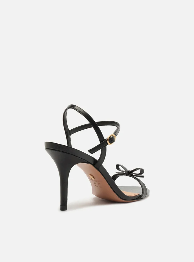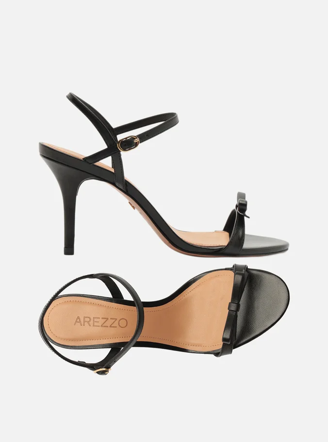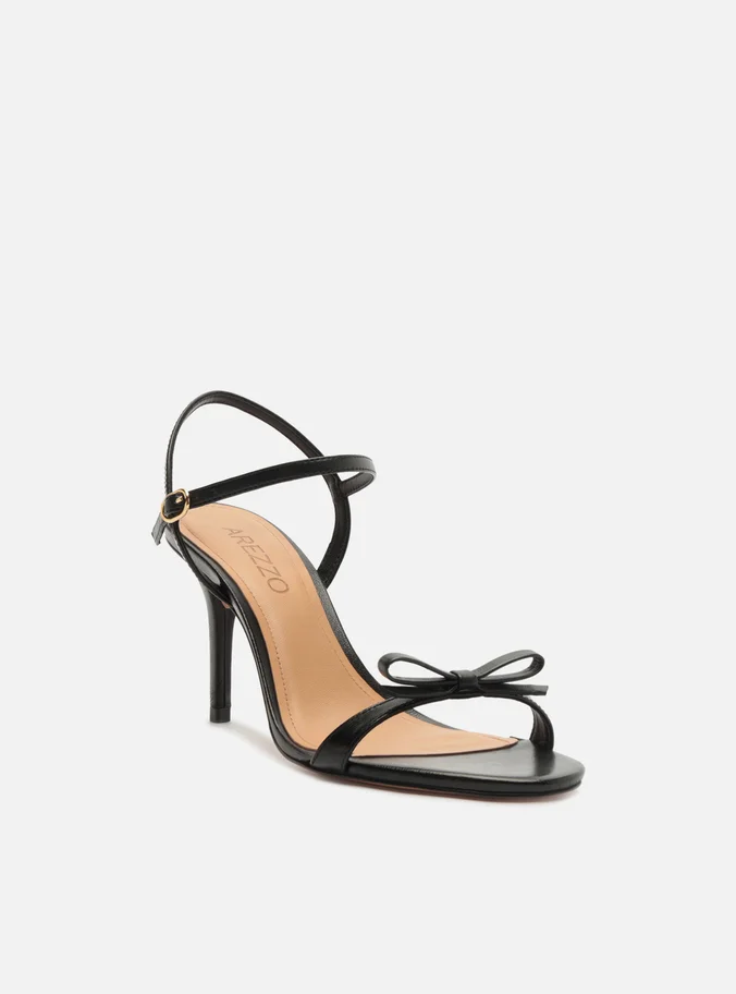 Sandália feminina preta. O sapato tem salto alto fino e formato arredondado na ponta. Traz tira única sobre os dedos com aplicação de laço. Possui tira fina que sai da parte lateral, cruza no calcanhar, contorna o tornozelo e fecha em fivela. Com palmilha bege e inscrição do nome da marca. A sandália exibe todo o pé.