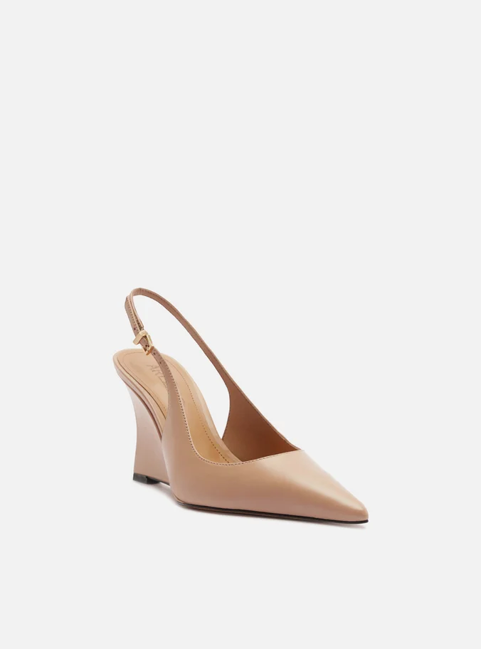 Scarpin feminino bege de couro. O sapato tem salto alto anabela e ponta fina. Traz cabedal com recorte arredondado sobre a parte superior do pé. Aberto, tem tira fina conectada ao cabedal que segue pelas laterais e contorna o calcanhar, com fivela metálica lateral. Com palmilha bege e inscrição do nome da marca. Exibe parte do pé.