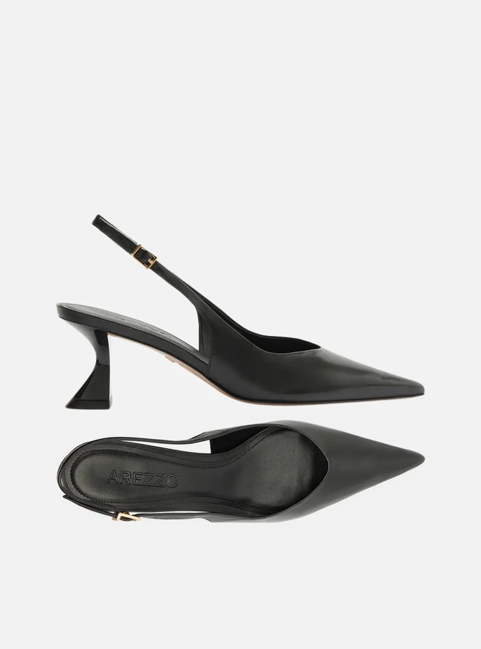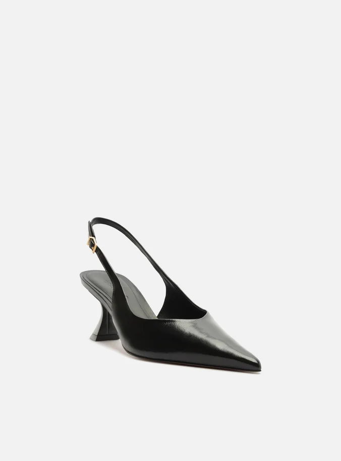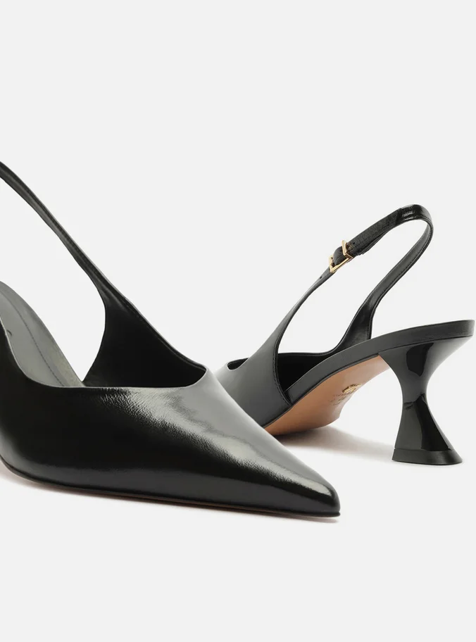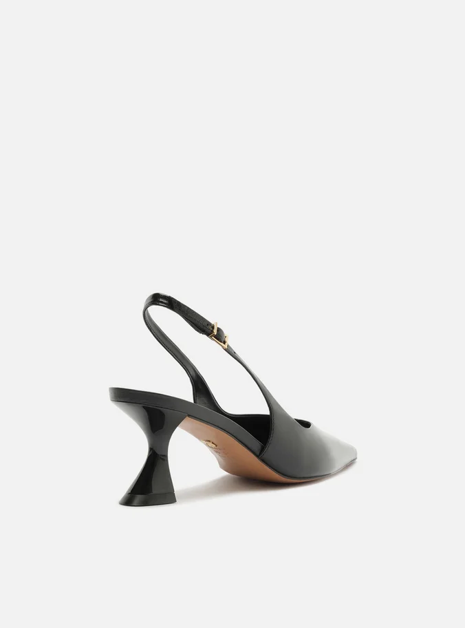 Scarpin preto de couro. O sapato tem salto médio bloco e ponta fina. Fechado na parte superior do pé, possui recorte geométrico no cabedal. Com formato contornado, seguir a forma do pé. Aberto atrás, tem tira estreita e fivela metálica lateral. Com palmilha preta e inscrição do nome da marca.