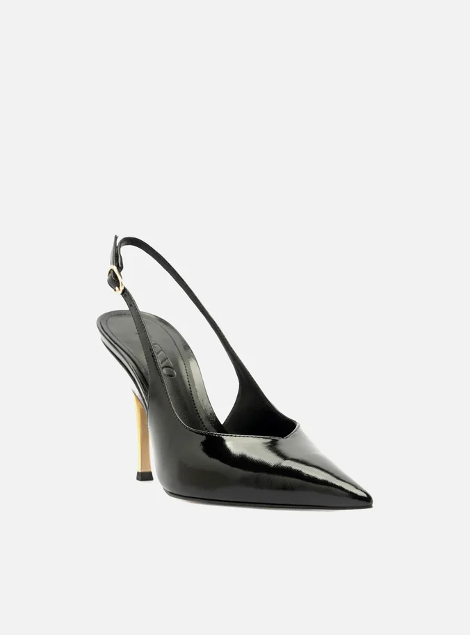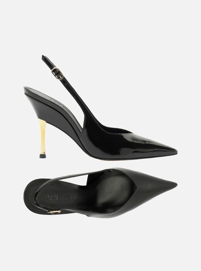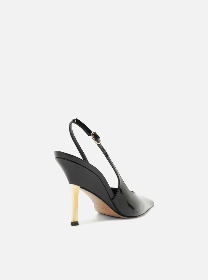 Scarpin feminino preto de couro com acabamento envernizado. O sapato tem salto alto fino dourado e formato fino na ponta. Possui tira slingback em torno do calcanhar com fivela lateral ajustável. Fechado na parte frontal, traz recorte em V na parte superior do pé. Com palmilha lisa e inscrição do nome da marca.